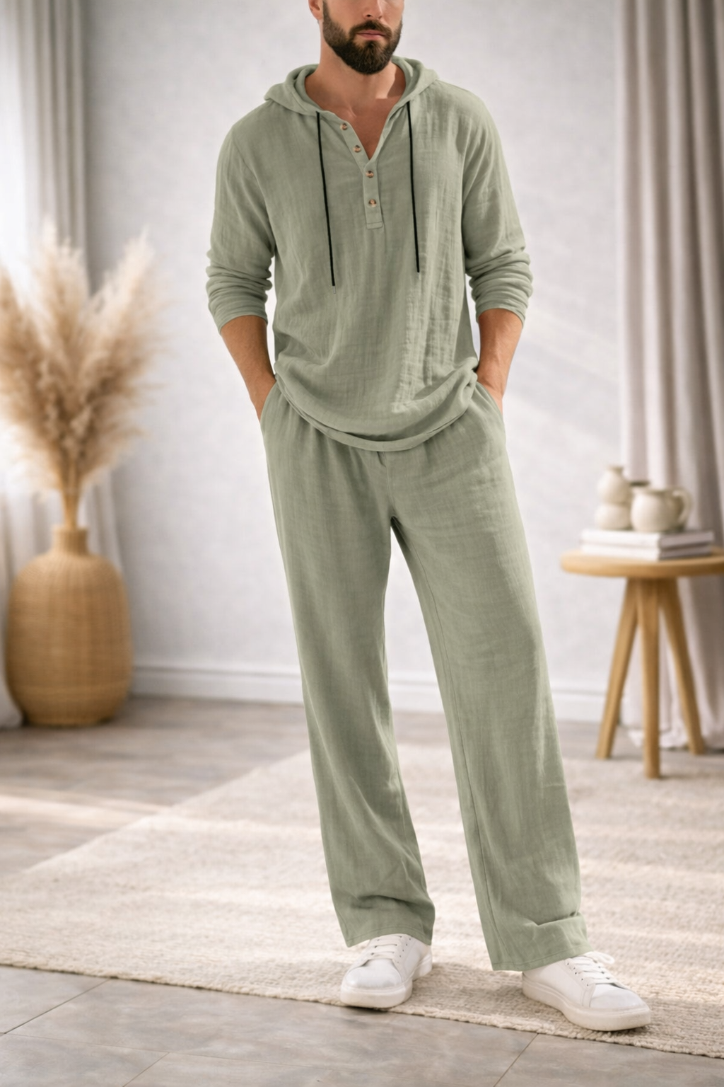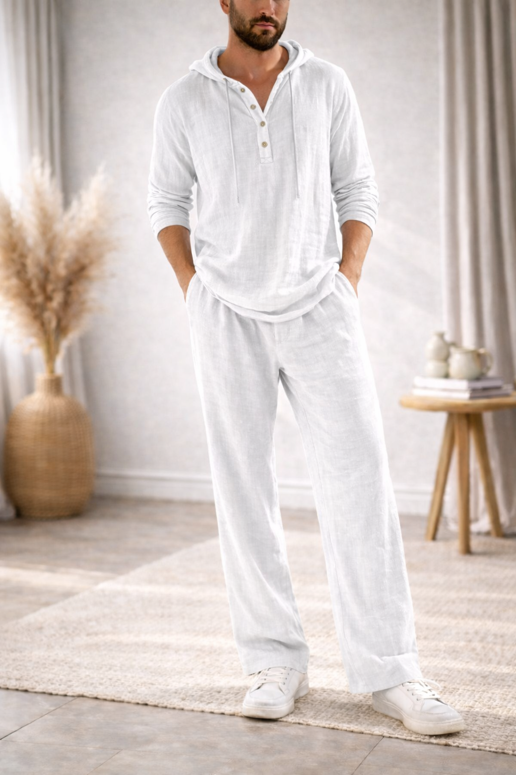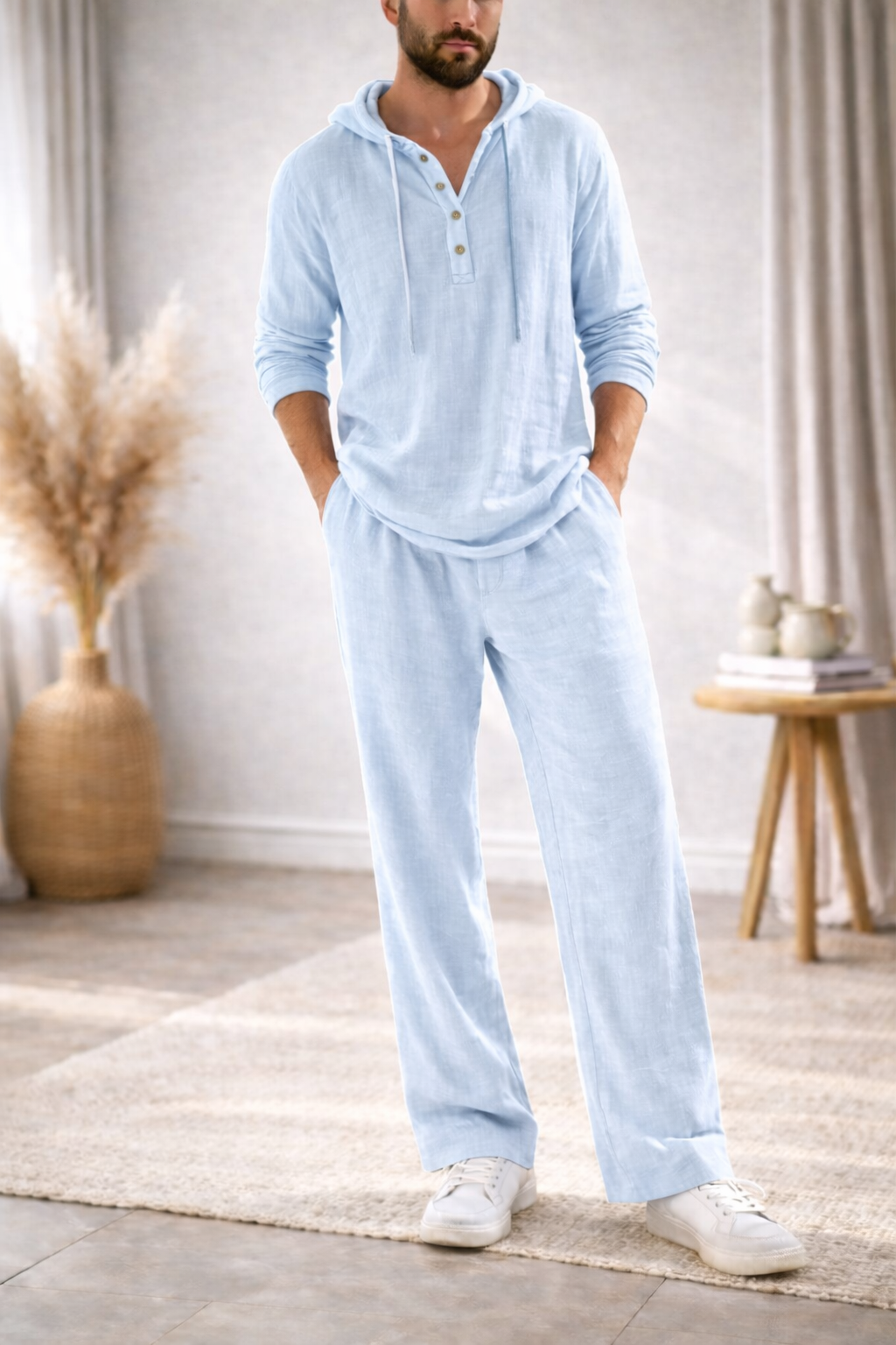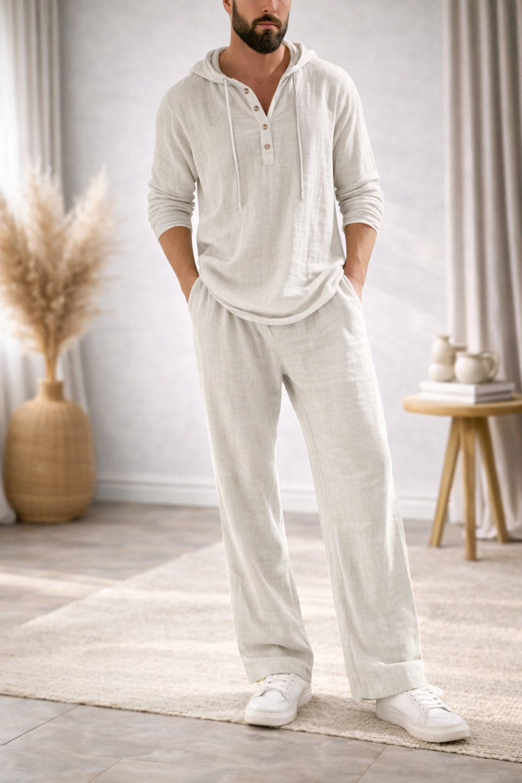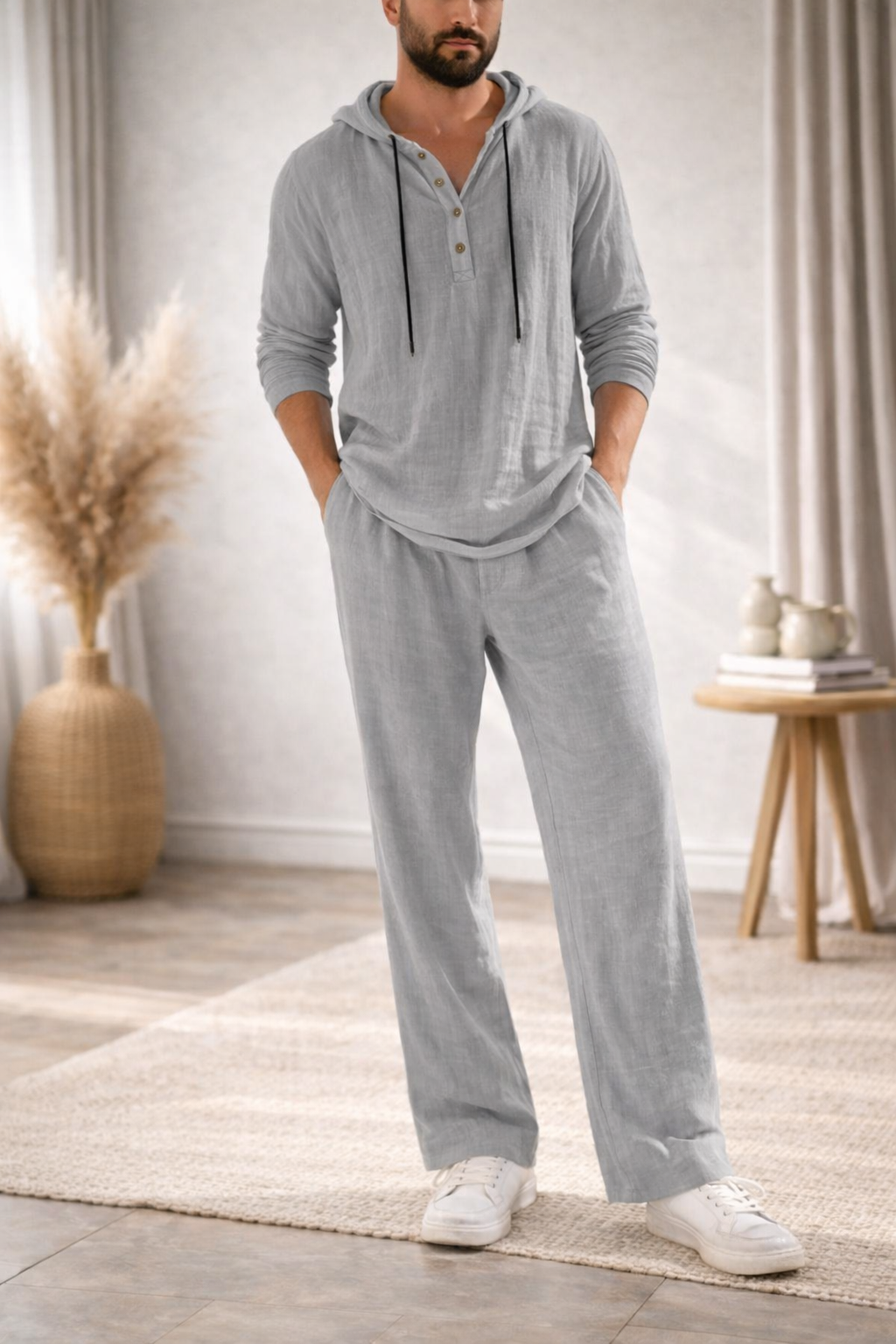 Pensé pour les hommes qui recherchent simplicité, confort et style, l’ensemble ÉLIAS™ associe une chemise légère à capuche et un pantalon fluide assorti.